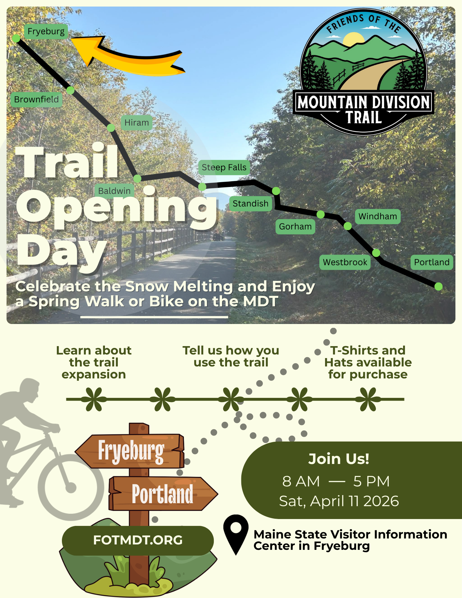 The Mountain Division Alliance’s mission is to work with the nine communities along the Mountain Division Rail corridor, Maine Department of Transportation, and other organizations and stakeholders to create a safe, welcoming, contiguous trail that connects existing paved portions of the trail to provide for active transportation and recreation opportunities from Fryeburg to Portland. For more information about the trail, visit https://mountaindivisionalliance.org.